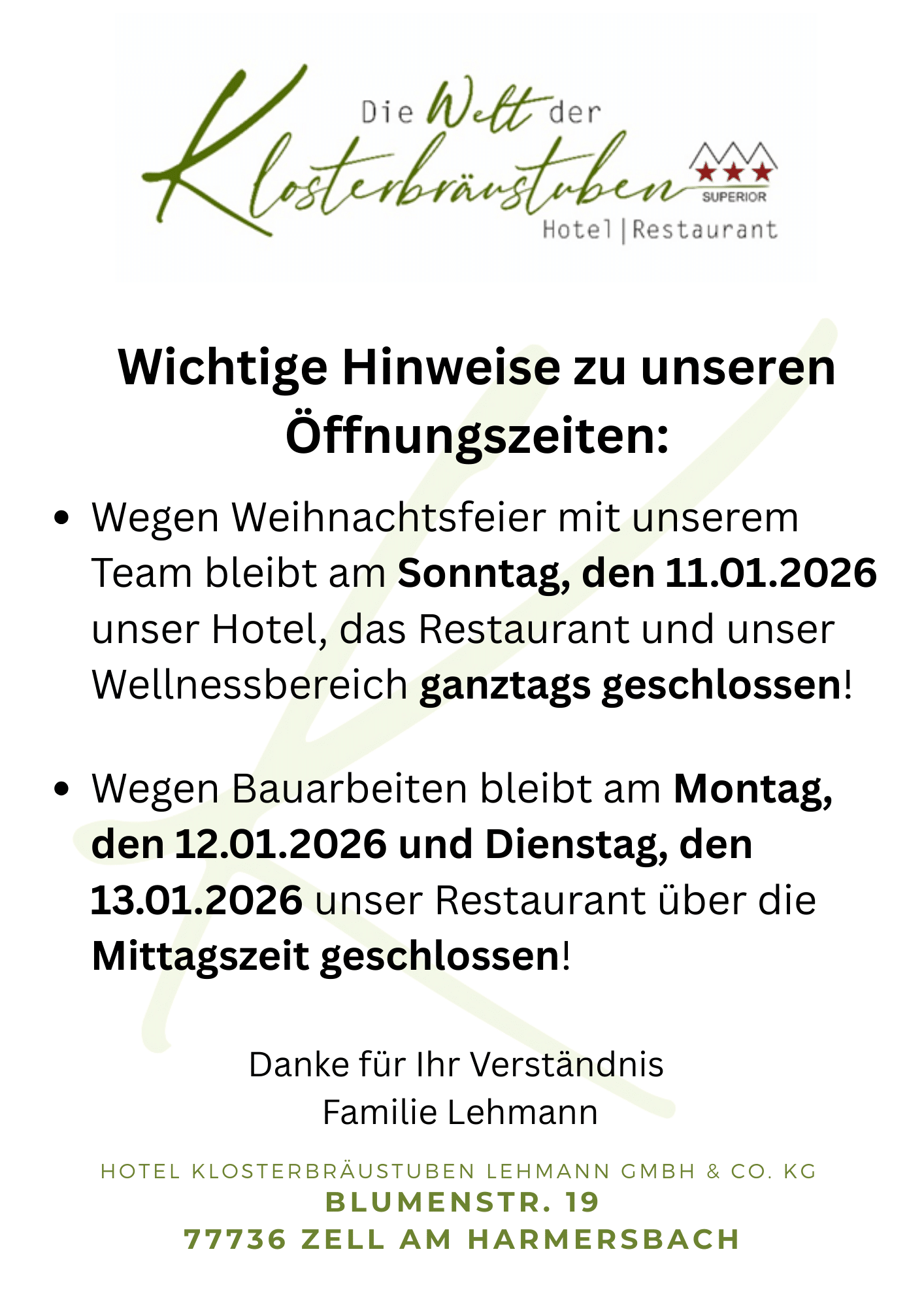 Hotel und Wellnessbereich bleiben geschlossen! Am Sonntag, den 12.01.2025 feiern wir zusammen mit unseren Mitarbeiter Weihnachten und unser Haus bleibt deshalb ganztags geschlossen! Auch der Wellnessbereich… Continue Reading Weihnachtsfeier für unsere Mitarbeiter